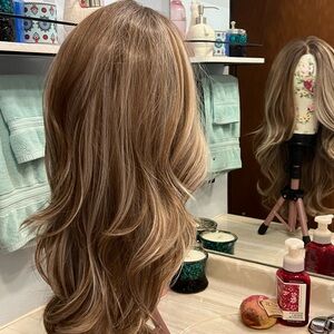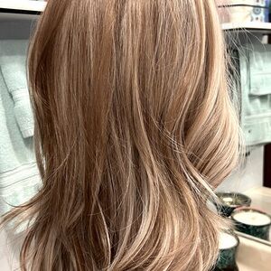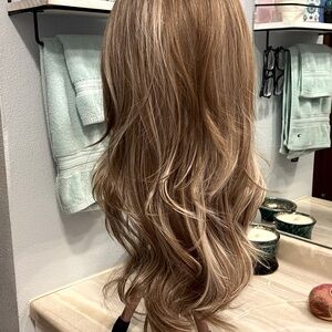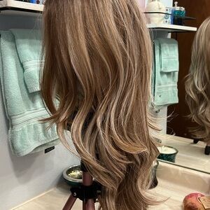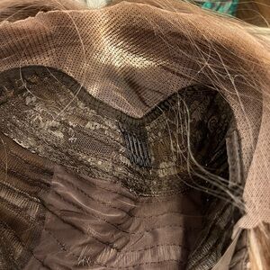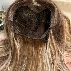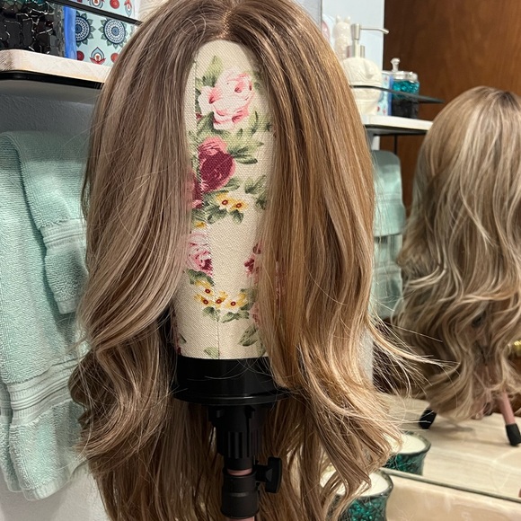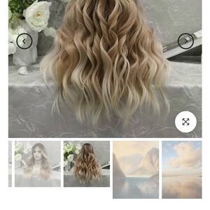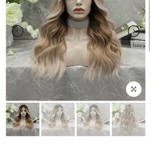 Gorgeous strawberry blonde new synthetic , only ever tried on, lace front free parting wig. Also glueless. Stunning color blend, curl pattern and length on this IMStyle beauty. Soft fibers and comfortable cap. She is so much prettier in person!!