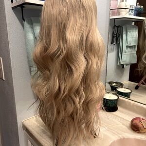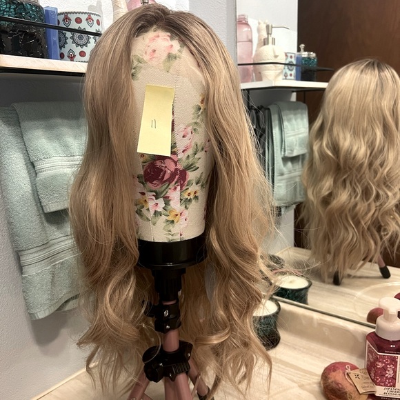 Brand new never worn only taken out for pictures. My lighting is weird, I feel like she is more of a golden blonde. She is very soft and surprisingly lightweight because she has a nice density to her. I’d say around 130. Pretty soft curl pattern that again my poor photography skills do not do justice to. I’m pretty sure the stock photo is a different color than what I have, I do not believe this specific wig in my color is available anymore. Not sure though.