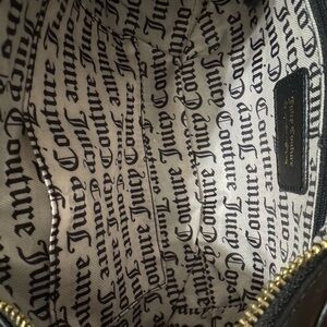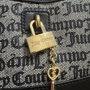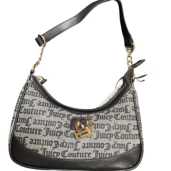 Embrace a blend of elegance and casual flair with the Juicy Couture Black and White Shoulder Bag. This stylish accessory showcases a striking gothic-style text print on a white background, complemented by black leather trim and a comfortable shoulder strap. The gold-toned hardware adds a touch of sophistication, making it a versatile choice for any occasion.