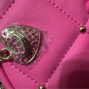 The Juicy Couture Pink Quilted Crossbody Bag is a stylish accessory that combines functionality with a playful design. Crafted from quilted leather with a diamond pattern, it features gold-tone hardware accents and an adjustable shoulder strap for versatile carrying options. The heart-shaped silhouette adds a unique touch, making it a standout piece in any collection.