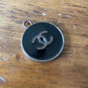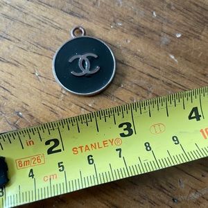 Stylish CHANEL brooch with black enamel and silver logo. Ideal for adding elegance.
