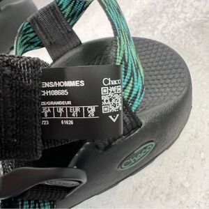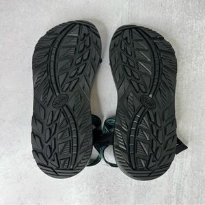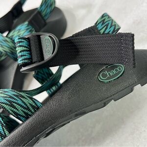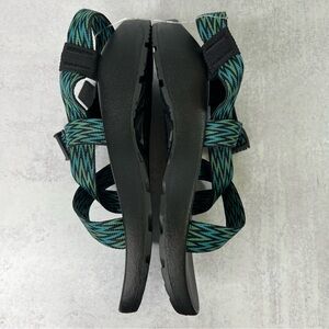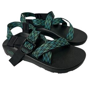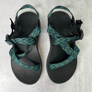 Durable Chaco sandals with vibrant teal and black straps. Ideal for hiking and casual wear.
