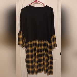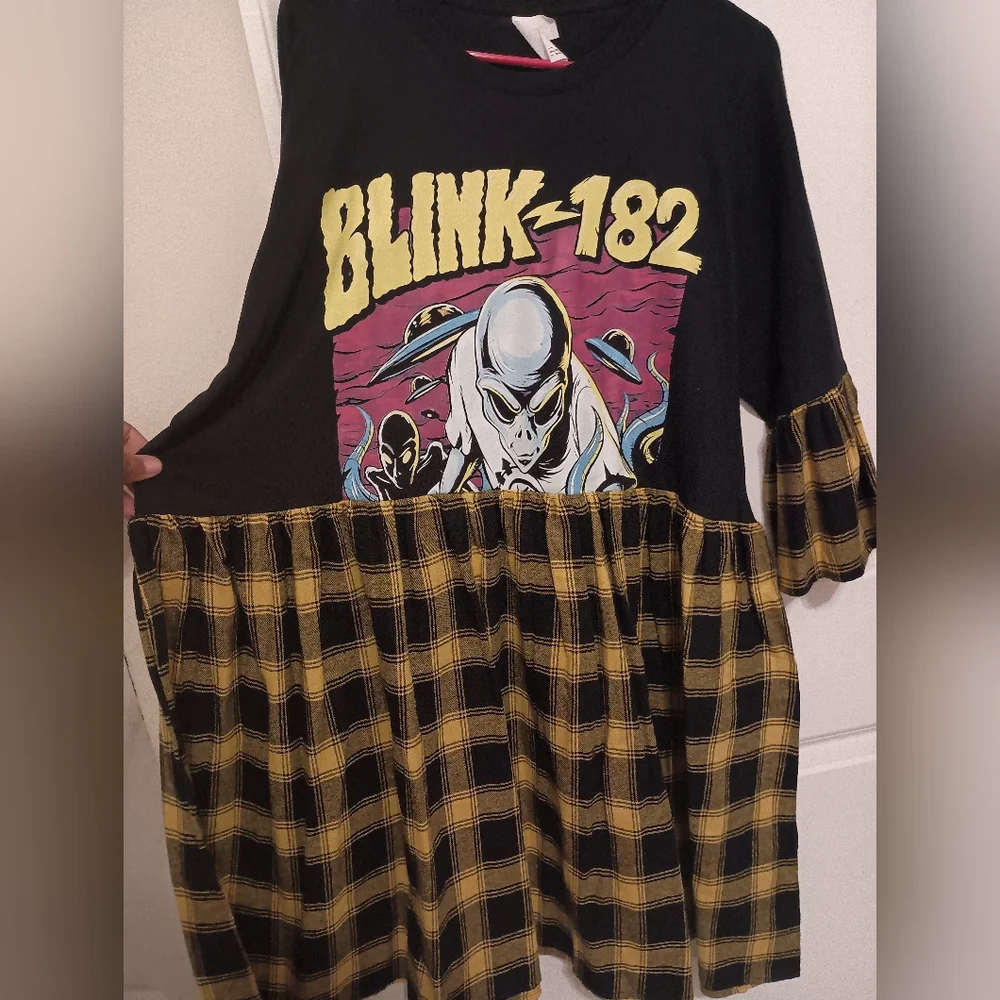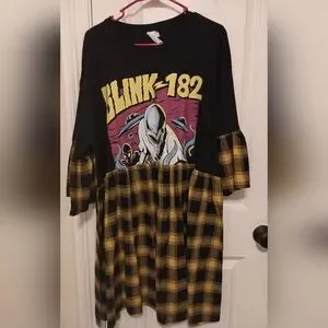 Band tee Upcycled smock dress. Never worn. Tee is a 2X. 24 inches pit to pit. 38.5 inches shoulder to bottom. Bottom is black and yellow/gold plaid. Sleeves have the same material at the ends. Material has a flannel feel. super cute just have three Blink 182 dresses so letting this one go.