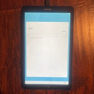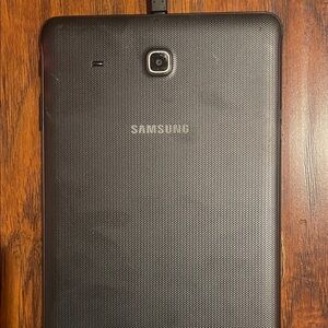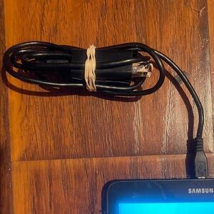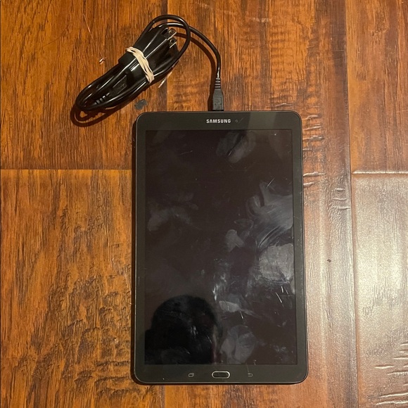 Samsung tablet featuring a sleek black bezel. Perfect for work and play. Includes charging cable.