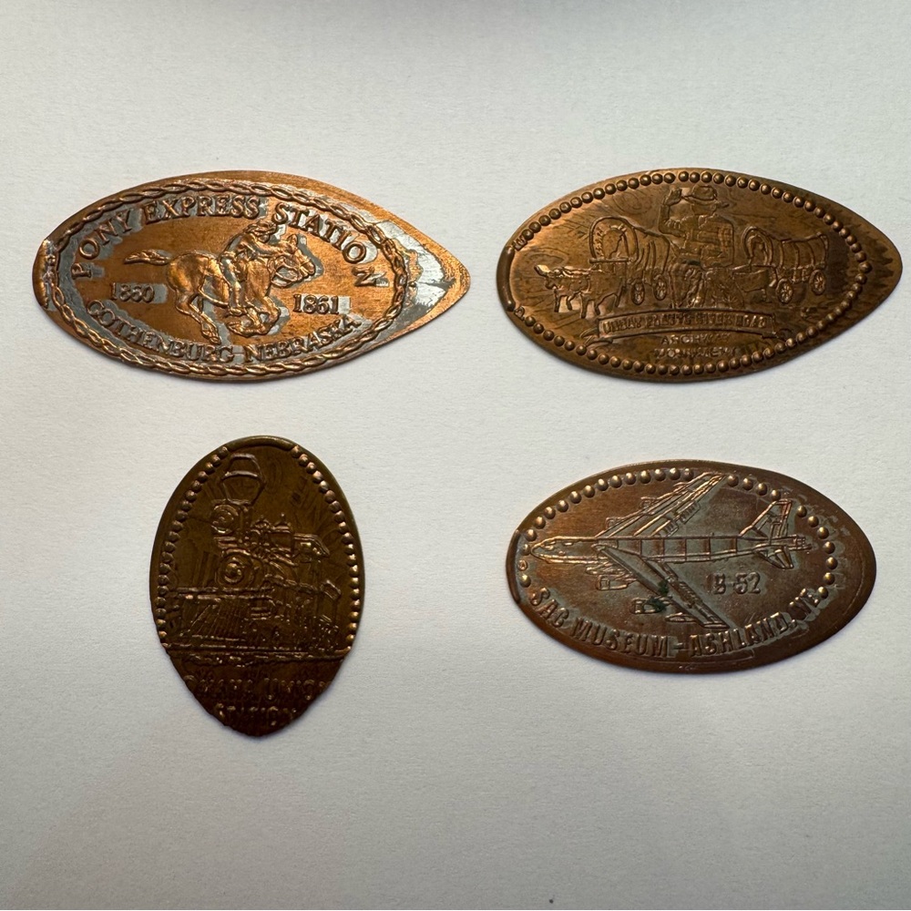 Set of 4 pressed souvenir pennies from Nebraska’s most iconic landmarks and attractions. Includes the Pony Express Station in Gothenburg, Omaha Union Station, the Strategic Air Command (SAC) Museum in Ashland, and the Platte River Road Archway Monument. A great collectible lot for penny press collectors or Midwest travelers. EUC.