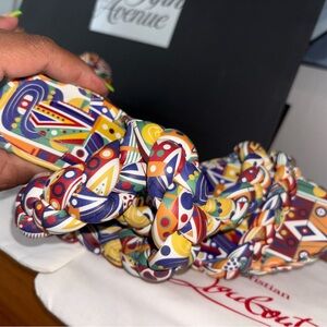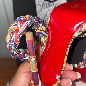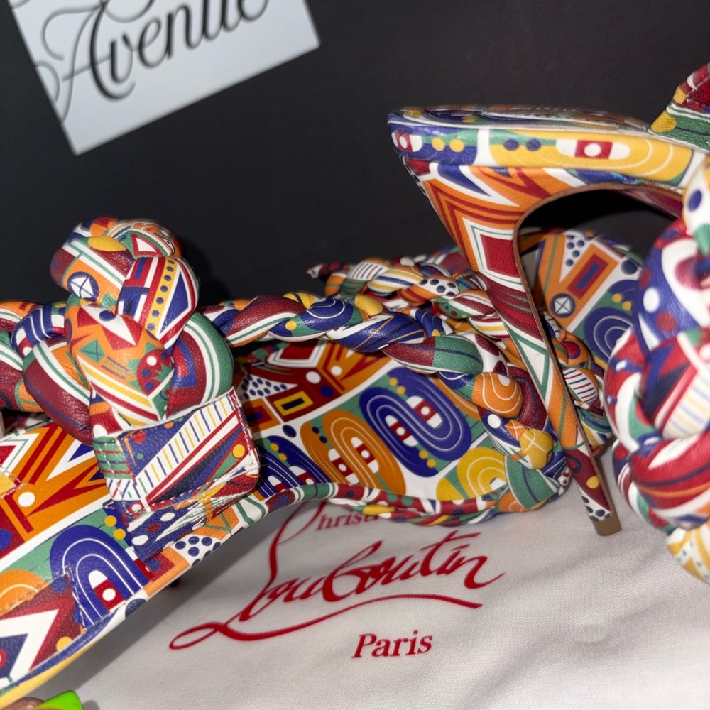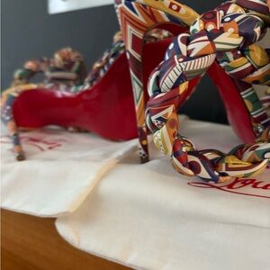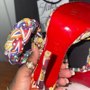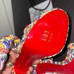 Vibrant multicolor heels with intricate patterns. Signature red sole. Perfect for a bold statement.