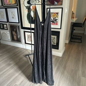 Black maxi top with spaghetti straps and deep plunge that clasps in front. Fabric has a shimmery pinstriping detail.