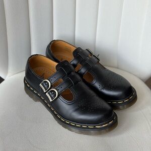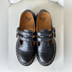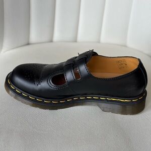 Dr. Martin's Mary Jane shoes. Built from Smooth leather with double straps, adjustable horseshoe buckles, and brogue detailing on the vamp.