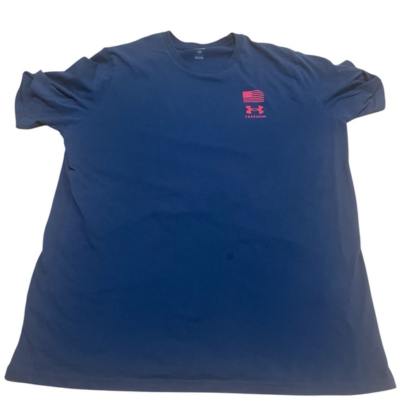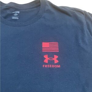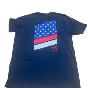 Under Armour Freedom Collection men’s short sleeve t-shirt. Features the UA logo and American flag graphic on front with a bold USA flag design on the back. Loose fit for training, workouts, or casual wear.