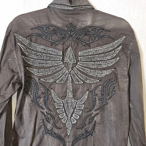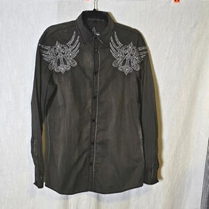 Introducing the Roar Strength Refined Long Sleeve Embroidered Y2k Button Down Shirt in size S. This shirt boasts a unique graphic print pattern, perfect for those who love the Aztec, motorcycle, rock, and cowboy themes. The button-down collar style and closure make it suitable for both casual and workwear occasions.