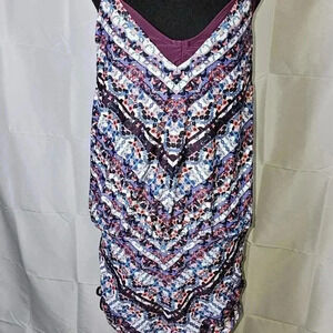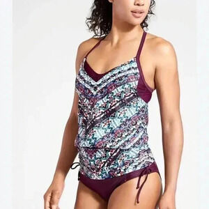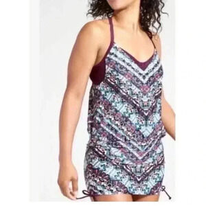 Add a pop of color to your beach wardrobe with this Athleta Marrakesh Side Scrunch Convertible Tankini Top Swim Dress in a vibrant Aztec pattern. Made of a stretchy blend of nylon and spandex, this top features adjustable straps, a built-in bra, and a flattering tank style. The side scrunch adds a touch of feminine flair while the convertible design allows for versatile styling. Perfect for a day at the beach or lounging by the pool. PIT TO PIT 15.5 in