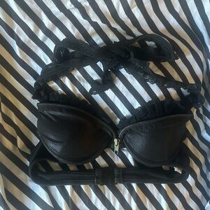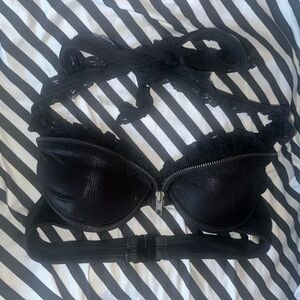 halter top, shiny wet look, lace detail, zipper design, padded show bra, frilly accents, edgy style, glossy finish, strapless top, alternative fashion
