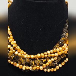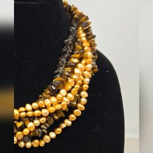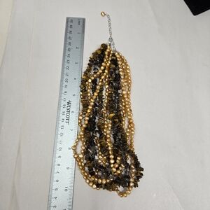 The Ross Simons Women's 7 Strand Necklace is a stunning piece of jewelry featuring tiger's eye and smoky quartz stones along with baroque fresh water pearls The necklace is 19 inches in length and is crafted with a lobster closure. Perfect for special occasions like anniversaries, birthdays, or christenings, this multicolor necklace exudes beauty and elegance. The beaded style and adjustable features make it a versatile addition to any jewelry collection, with a theme that captures the essence of the beach or nature.