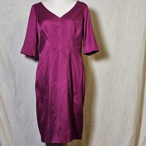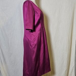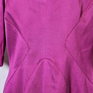 This Lela Rose dress is a stunning knee-length piece in a vibrant fuchsia color. Made from a luxurious blend of silk, viscose, cotton, and elastane, it features a flattering A-line silhouette with a V-neck and 3/4 sleeves. The dress is lined and has a back slit for ease of movement. Ideal for weddings, parties, formal occasions, or workwear, this elegant garment exudes a classic and timeless style. Crafted in the United States, it is designed for a size 14 fit and requires dry cleaning to maintain its quality.