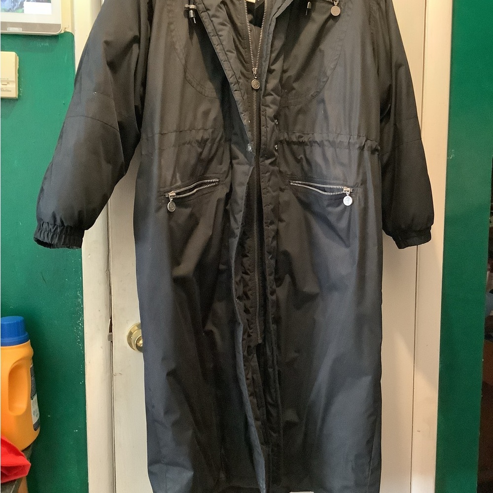 Full length (50”) black down filled coat with zippers pockets and front. Ideal for a cold winter. Hood is missing.