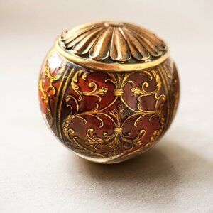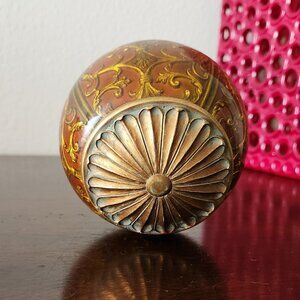 Measuring 5" in diameter and weighing close to 1 lb, it’s a solid, beautifully crafted piece. The orb’s core is likely wood, carved with intricate raised scrollwork in an antique gold finish. Over this, a layer of clear glass has been carefully applied, adding a glossy depth and letting the golden design shimmer through. Both poles are capped with bronze-colored metal rosettes, shaped like blooming flowers, giving it a refined finishing touch.