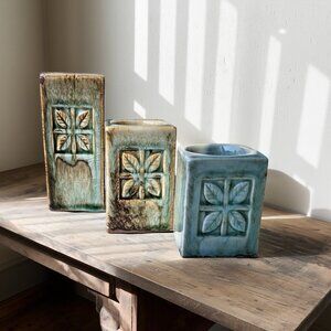 This vintage vallauris trio is crafted in heavy ceramic with a square, architectural silhouette and deeply carved leaf motifs on front side. The glaze blends shades of sage green, teal, and earthy browns, pooling in ways that highlight the textured surface — a hallmark of mid-century and late 20th-century European ceramic design.