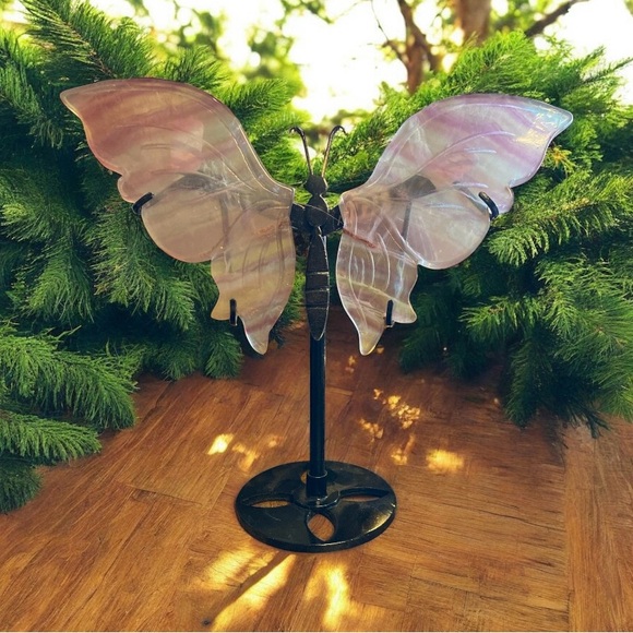 Pink rainbow fluorite carved butterfly wings with metal stand