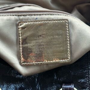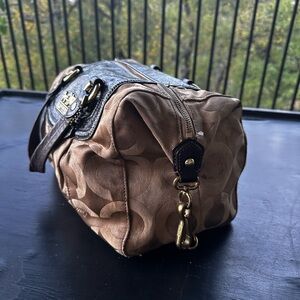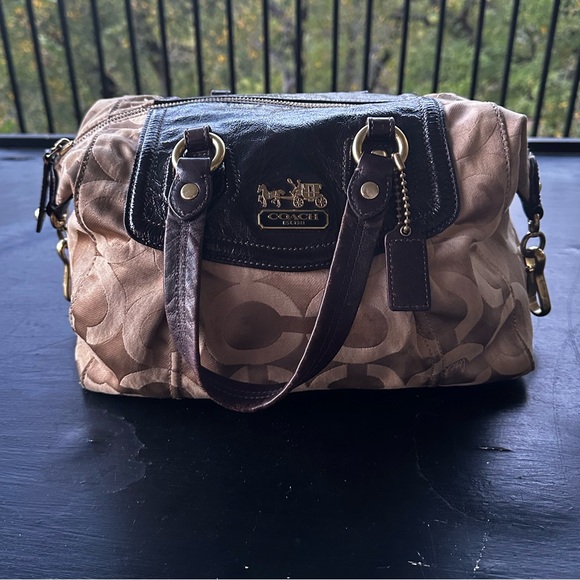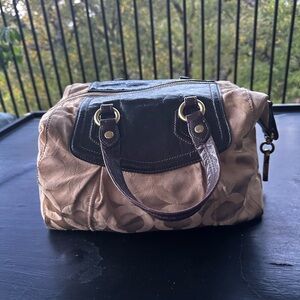 Elegant Coach satchel with signature pattern. Features black leather accents and sturdy handles.