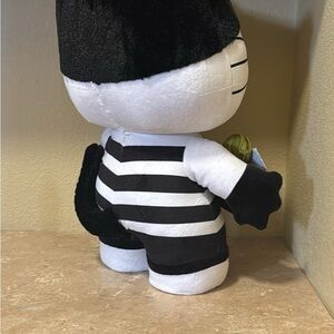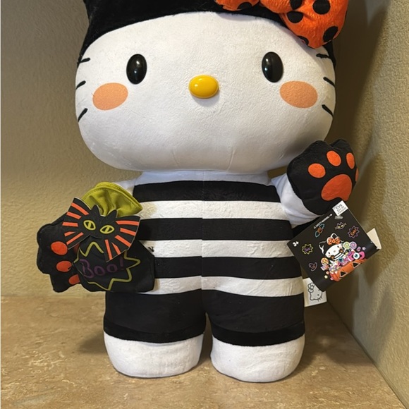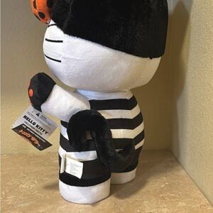 Adorable Hello Kitty plush in Halloween theme. Features black and white stripes. Orange bow and paw accents. Perfect for holiday decor.