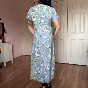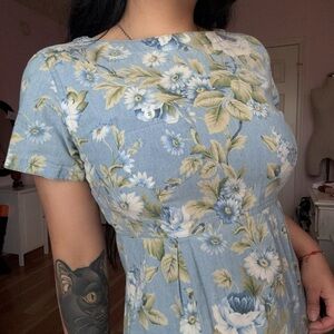 Baby blue with white roses pattern by Liz Claiborne • Hidden zipper down back • One single pocket on left side of chest • Semi heavyweight denim like material