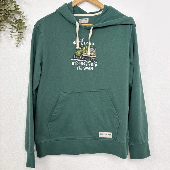 Keywords: Life is Good, Hoodie, Green, Mens, Small, What A Long Strange Trip It's Been, Jeep, Casual, Comfortable, Relaxed, Graphic Hoodie, Pullover, Hooded Sweatshirt, Travel