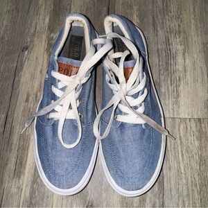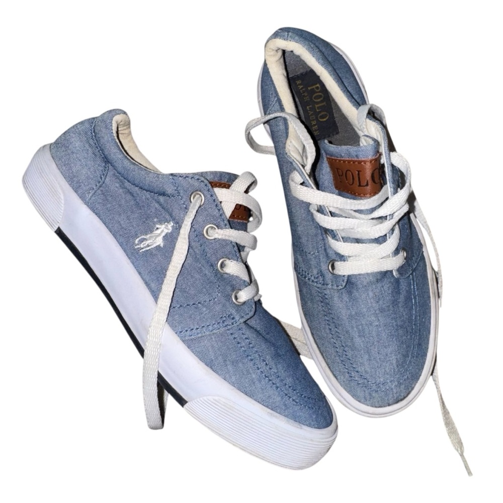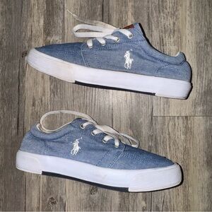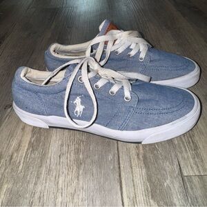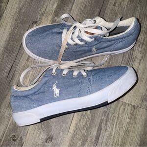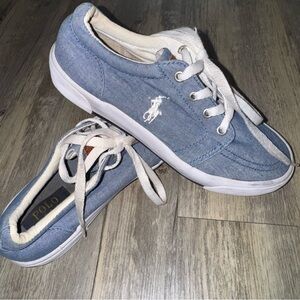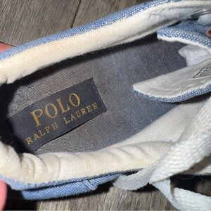 Light blue canvas sneakers with white accents. Features Polo branding inside. Super adorable polo sneaks size 5 women. Shoe laces could probably be washed, overall great preloved condition!
