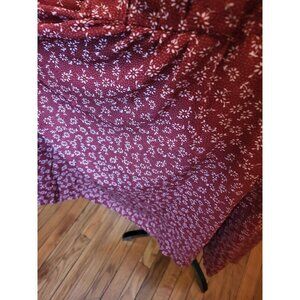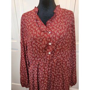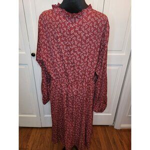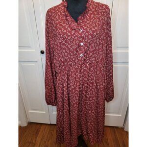 Burgundy ditsy floral print midi dress comes to you in new without tags condition. Dress features an elastic waist, gathered sleeves, full skirt, ruffled neckline, and buttons. Dress is marked as XXL but fits small. Fits more like a 14.