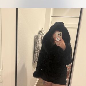 Elevate your style with this chic black faux fur teddy jacket. Perfect for adding a touch of elegance to any outfit.