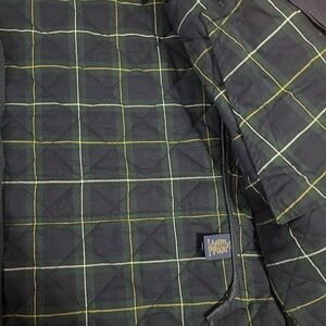 Blue and green plaid interior and navy exterior. Quilted.