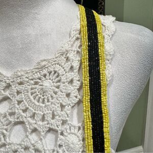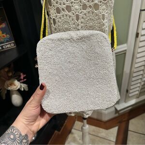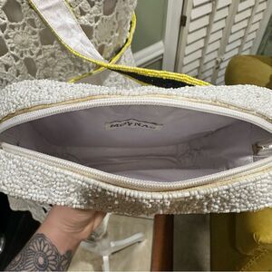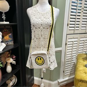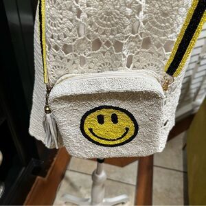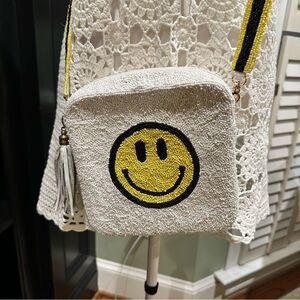 Spread good vibes wherever you go with this playful and stylish beaded crossbody bag by MOYNA. Featuring an iconic yellow smiley face on a soft white background, this bag is hand-beaded and finished with a matching tassel and black-and-yellow strap for a bold, fun touch.