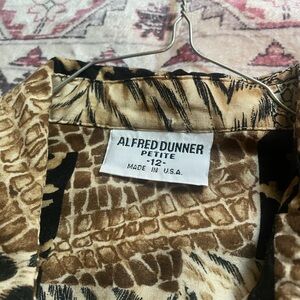 Bold animal print design. Short sleeves. Button-down style. Perfect for casual outings.