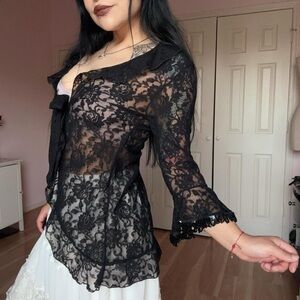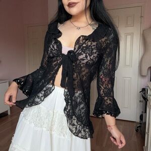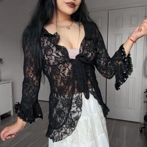 Black lace cardigan shawl by Dreamgirl • Ties on front for closure • Settle bell sleeves with sequin details • Soft stretchy lace