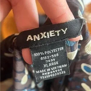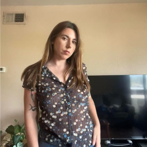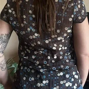 Brown blouse with adorable polka dot design shirt is somewhat sheer. Brand is a vintage Y2K brand Anxiety tagged an xtra large but seems a bit smaller. Message for measurements:)