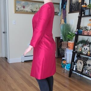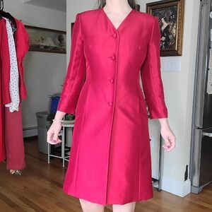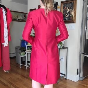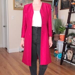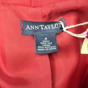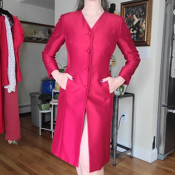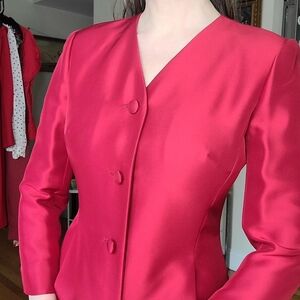 The most beautiful 1990's red silk jacket from Ann Taylor. Features bodice and bust darting, lightly padded shoulders, silk covered partial front buttons, a liner and it has such a lovely silhouette. Contains a couple small snags and a very faint discoloration or two - overall in great shape! Slightly darker and not quite as vibrant as shown