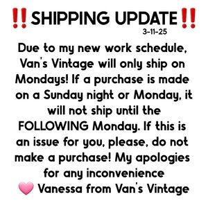 ‼️Due to my new work schedule, Van's Vintage will only ship on Mondays! If a purchase is made on a Sunday night or Monday, it will not ship until the FOLLOWING Monday. If this is an issue for you, please, do not make a purchase! My apologies for any inconvenience‼️