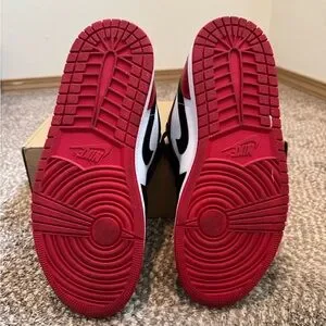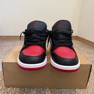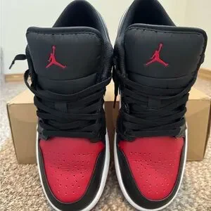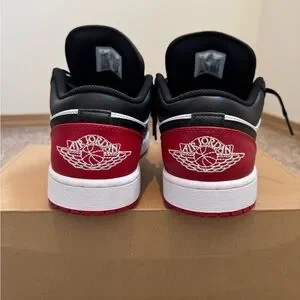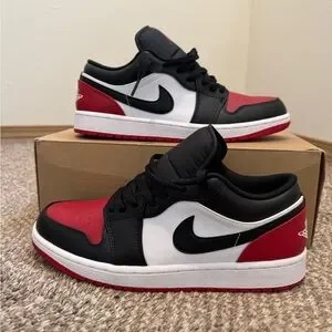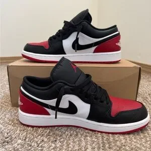 Stylish low-top sneakers in black, red, and white. Perfect for casual wear.