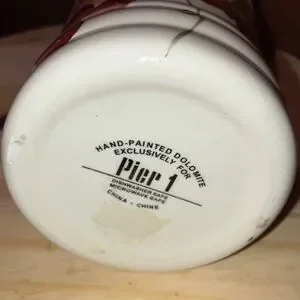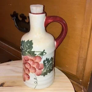 Charming ceramic jug with a red handle. Features a floral design with green leaves. Perfect for kitchen decor.