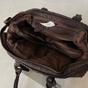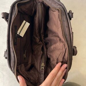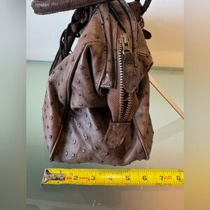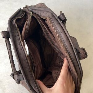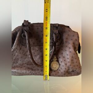 brown leather, ostrich texture, snail charm, mushroom pendant, luxurious handbag, decadent color, striped interior, designer bag, high-end accessory, statement tote