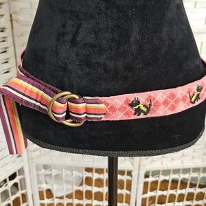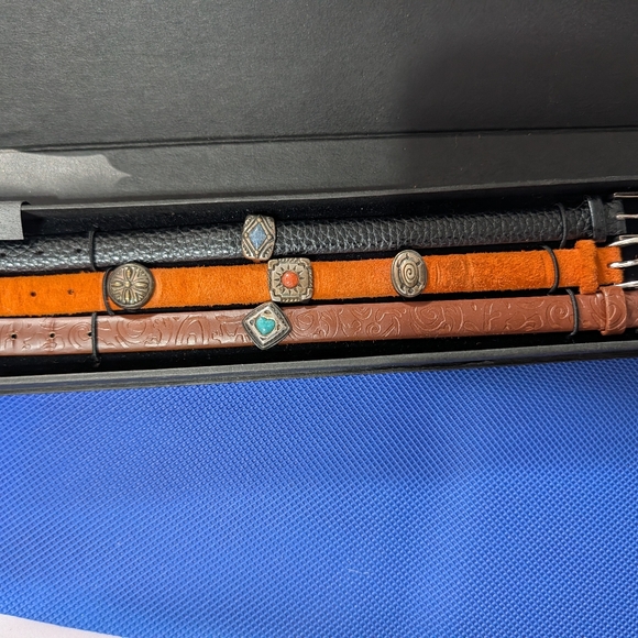 Middle bracelet: Burnt orange suede band with three silver concho-style charms—one with a turquoise-colored stone, one with a coral-colored stone, and one with an etched oval silver design.