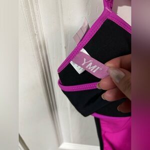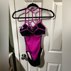 Stylish one-piece swimsuit. Features vibrant pink and classic black. Perfect for beach or pool.