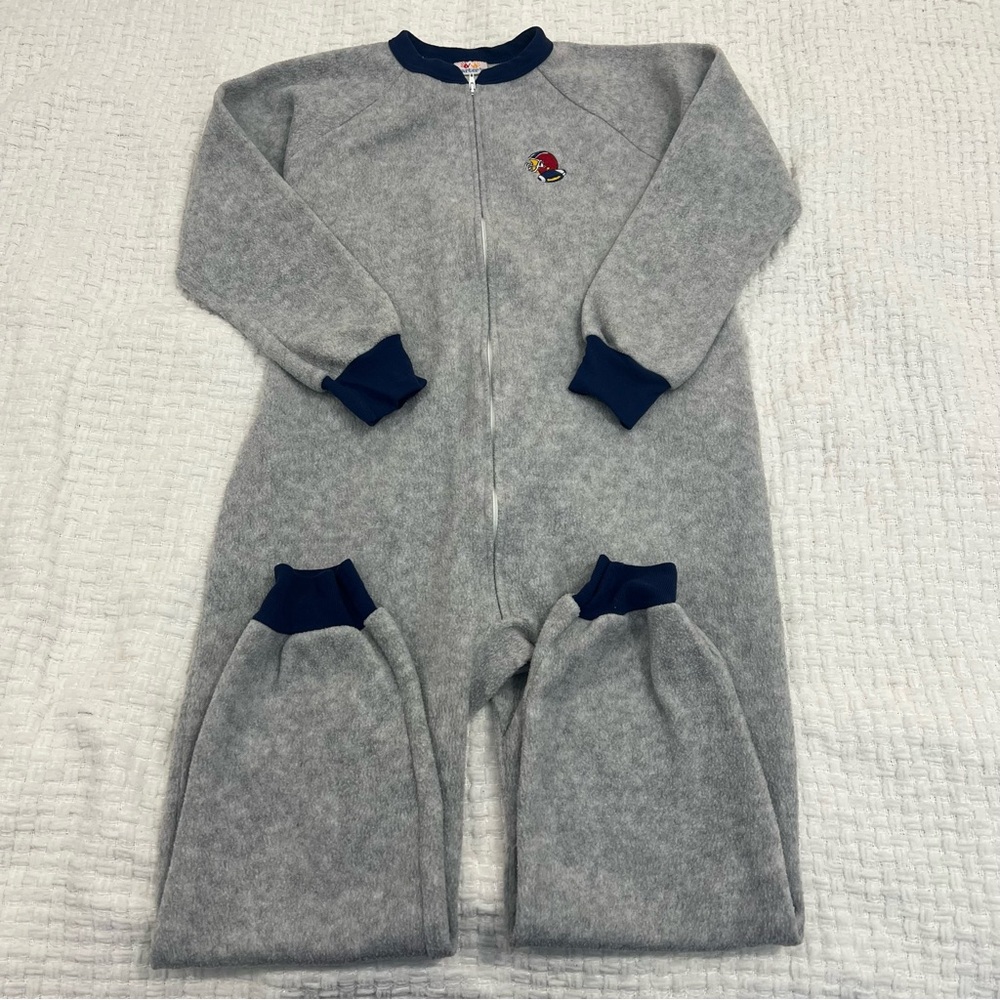 Vintage Carter’s gray fleece one-piece onesie with navy trim and jogger cuffs (non-footed). Zip front with embroidered football and helmet patch.