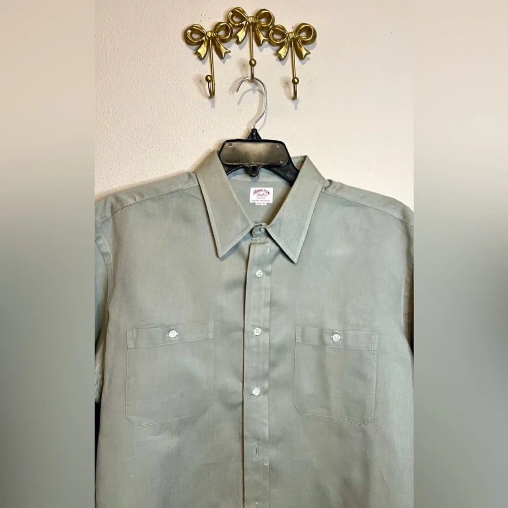 Stylish Hamilton moss green dress shirt. Features a classic collar and buttoned with one pocket. Perfect for formal occasions.