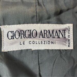 Sophisticated Giorgio Armani label. Features 'Le Collezioni' text. Made in Italy.