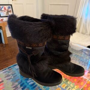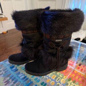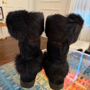 Chic black boots with goat hair and plush fur. Vintage alpine luxury to keep you warm and cozy. Ideal for winter wear. Made in Italy.