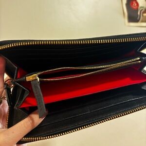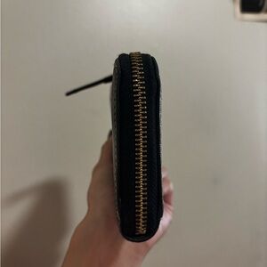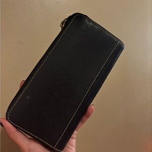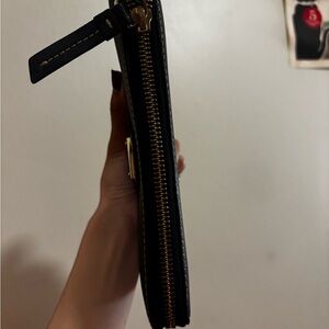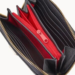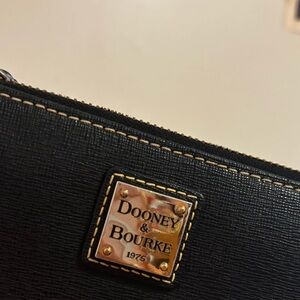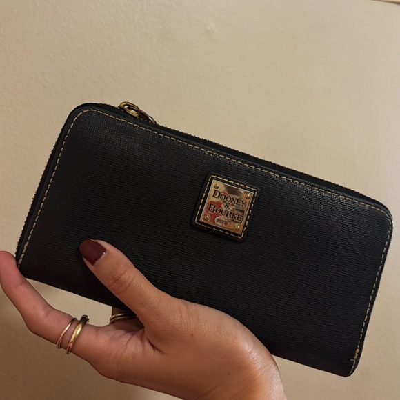 Chic black wallet featuring a gold logo plate. Stylish accessory by Dooney & Bourke ๐๐
