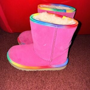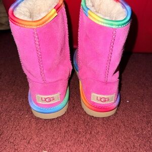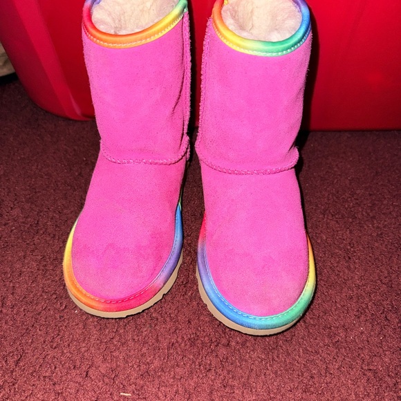 Bright pink UGG boots featuring a vibrant rainbow trim. Stylish and colorful footwear.