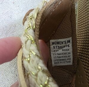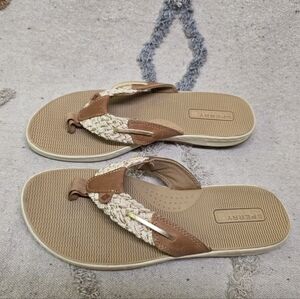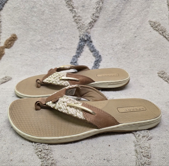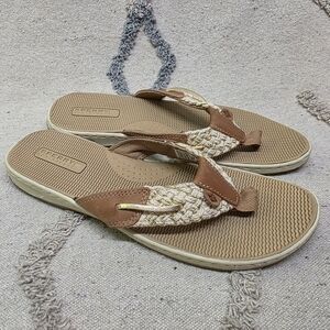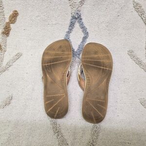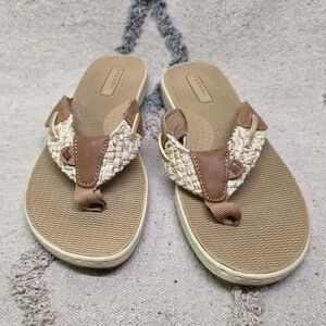 Stylish Clarks sandals with a brown and cream color scheme. Perfect for any occasion.