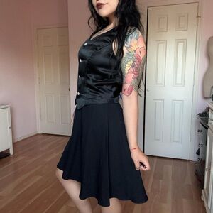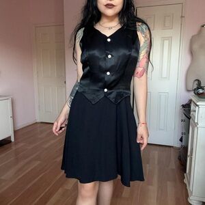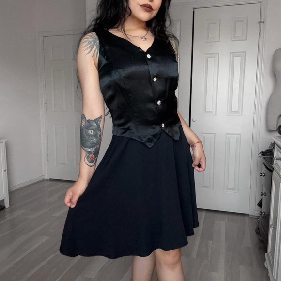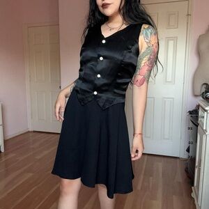 Black button up vest dress by Alix Taylor • Invisible zipper on left side • 4 original daisy buttons down vest • Cute cage life detailing on back • Soft lightweight satin material