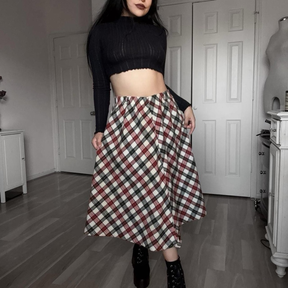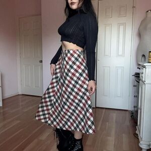 Red and green plaid midi skirt by Punch Line! • Elastic waistband with belt loops • Very cozy wool blend material • Perfect for a chili autumn night out
